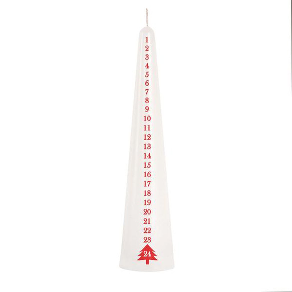 Kužeľovitá adventná sviečka s dĺžkou 25 cm vytvorí vo vašom domove príjemnú atmosféru. Na sviečke sú zobrazené kalendárne dni, ktoré miznú, keď sviečka horí. Nezabudnite dbať na svoju bezpečnosť a dodržiavať bezpečnostné piktogramy na sviečke. Materiál parafín. Farba biela.Dodatočné parametre
