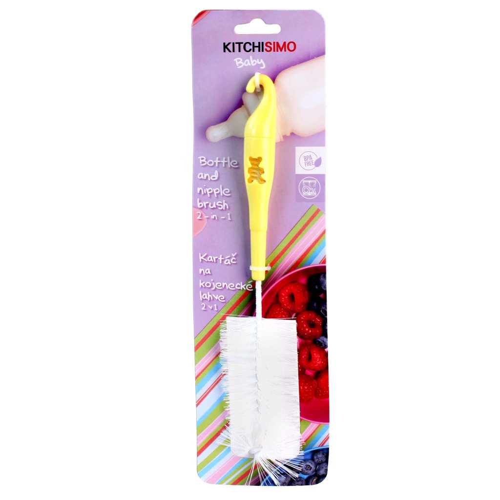 Kefka na dojčenské fľaše a cumlíky Kitchisimo Baby 2v1 je šikovný a všestranný pomocník, ktorý urobí každodennú starostlivosť o detský riad a potreby oveľa jednoduchšie a hygienickejšie. Vďaka špeciálnemu tvaru hlavy kefy dosiahnete ľahko do úzkych miest fliaš, dojčenských fľaštičiek, hrnčekov aj športových fliaš - dôkladne odstránite mliečne usadeniny aj iné zvyšky tekutín.
