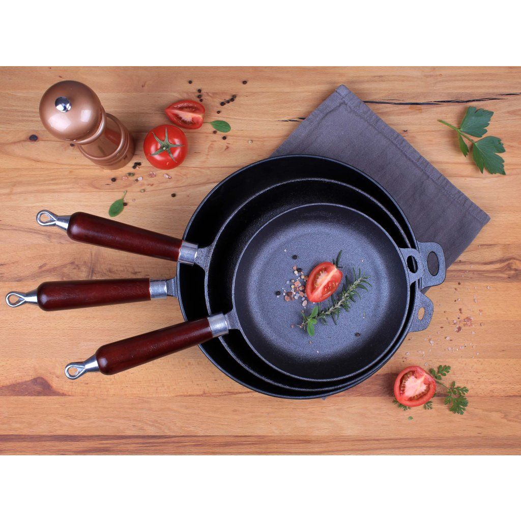 Veľkou výhodou liatiny je aj jej dlhá životnosť – pri správnej starostlivosti vám panvica vydrží dlhé roky a často sa odovzdáva aj medzi generáciami. Postupom času si naviac vytvára prirodzene nepriľnavý povrch, ktorý zlepšuje jej vlastnosti pri každom ďalšom použití. Drevená rukoväť zaisťuje pohodlný úchop a dodáva panvici elegantný vzhľad, ktorý sa hodí ako do modernej kuchyne, tak aj na chalupu. Liatinová panvica KITCHISIMO Maestro je vopred ošetrená rastlinným olejom a je tepelne odolná až do 260°C.