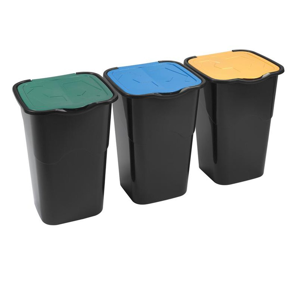 Plastový odpadkový kôš HEIDRUN 3 x 50 litrov. Sada 3 kusov plastových odpadkových košov HEIDRUN zaujme svojím jednoduchým dizajnom. Voľne stojace koše s objemom 50 litrov sú vhodné pre väčšie rodiny, kancelárie, čakárne alebo aj menšie spoločenské akcie. Výklopné veká sú farebne odlíšené podľa druhu odpadu - zelené, modré, žlté. Ideálny pomocník pri triedení odpadu.