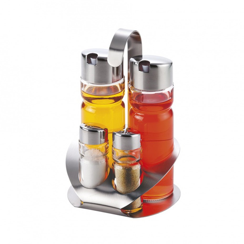 Jedálny lístok je jedným z klasických pomocníkov v domácnostiach a reštauráciách. Skladá sa zo soľničky, koreničky a dvoch nádob na olej s nálevkou. Všetko je umiestnené na stojane s praktickou rukoväťou na jednoduché prenášanie. Materiál - nehrdzavejúca oceľ, sklo. Priemer misky - 4,5 cm. Rozmery - 4,5 x 15,5 cm.Dodatočné parametre