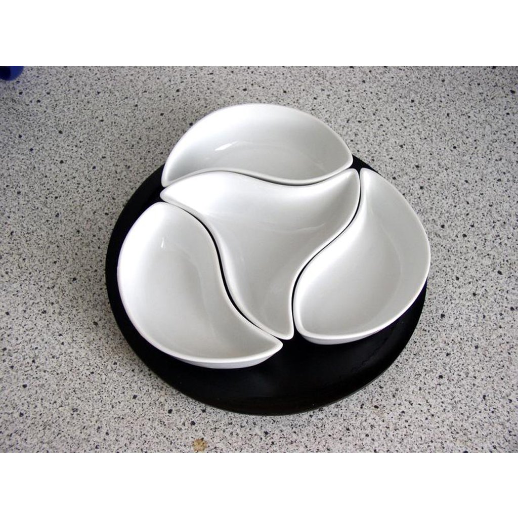 Velmi oblíbená sada čtyř misek "větrník" na dřevěném otáčivém podnose. Velmi praktická při servírování různých pokrmů. Misky mají pěkný moderní design a tvarově jsou velmi zajímavé, Podnos je snadno omyvatelný, stačí přetřít vlhkým hadříkem. Misky jsou vhodné do myčky na nádobí. Objem misek 125 ml. Rozměry - 12,6 x 4,3 x 12,6 cm.