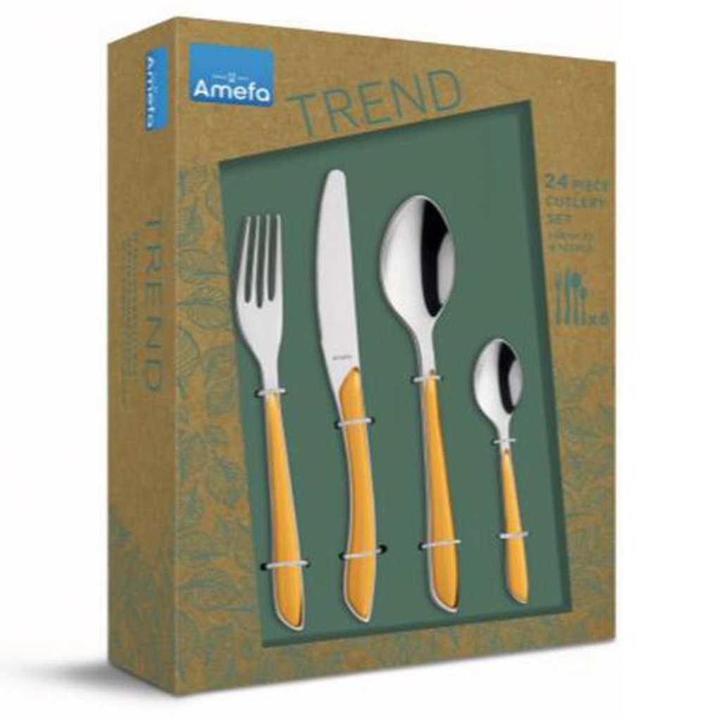Sada príborov AMEFA Éclat premieňa každý stôl na priestor s výrazom — decentná žltá farba rukovätí dodáva stolovaniu energiu, šmrnc a osobitý štýl bez toho, aby obetovala kvalitu. Vyrobená z nerezovej ocele, povrch s vysokým leskom („high gloss“) zachováva elegantné aj praktické vlastnosti: odolnosť voči korózii, ľahké čistenie a vizuálnu príťažlivosť. Tvar príborov je moderný, rukoväte majú príjemný profil, vhodný pre bežné aj slávnostné chvíle, a príjemná žltá je ideálnou voľbou pre tých, ktorí chcú stolovanie ozvláštniť - či už pri rodinnej večeri, barbecue alebo pri spoločenskej hostine.