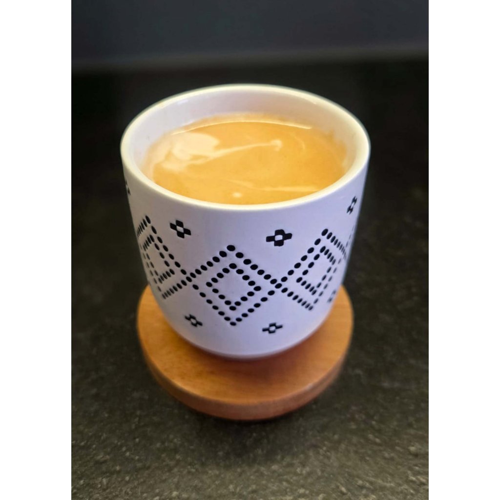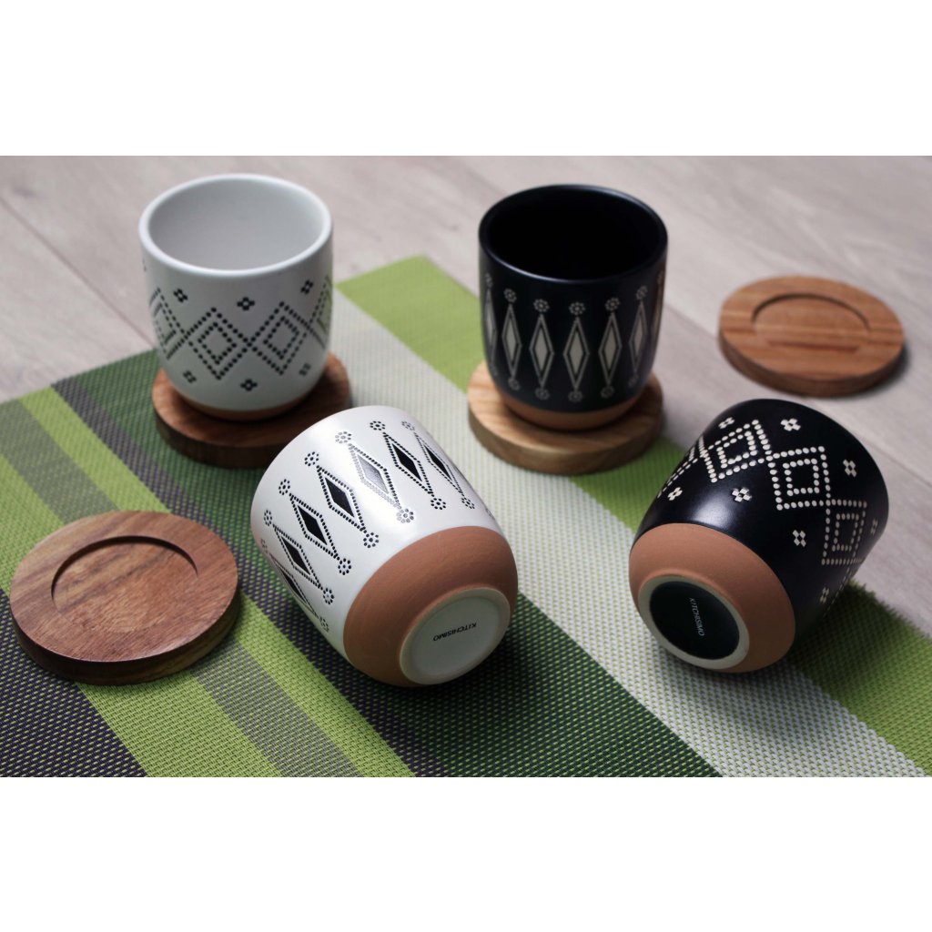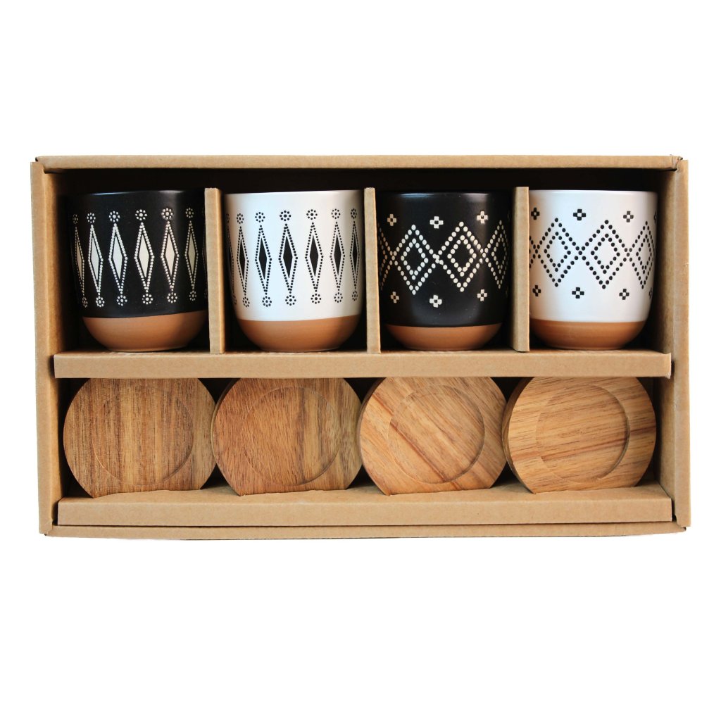 Keramické šálky sú vhodné pre bežné teplé nápoje - kávu, čaj, horúcu čokoládu aj iné obľúbené nápoje. Pred prvým použitím odporúčame šálky umyť vlažnou vodou s jemným saponátom. Šálky môžete umývať aj v umývačke riadu, ale drevené podšálky je lepšie umývať iba ručne, aby si zachovali svoju kvalitu a povrch bez poškodenia. Pri servírovaní dbajte na to, aby bol stôl suchý, aby podšálky lepšie plnili svoju ochrannú a estetickú funkciu. Súprava štyroch kusov je ideálna na zdieľanie pohladenia pri stole s rodinou či priateľmi — a vďaka atraktívnej prezentácii v krabici ju môžete venovať ako krásny darček, ktorý poteší oko aj dušu.