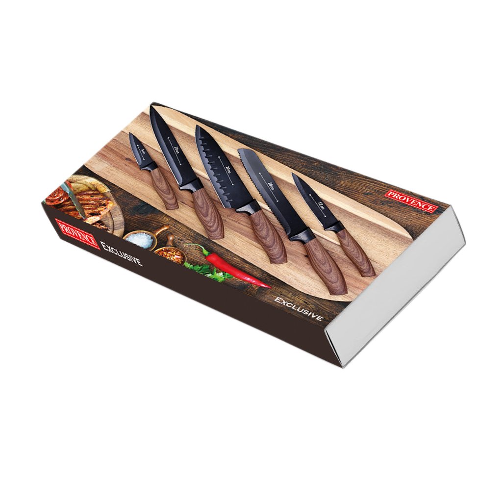 Sada nožov PROVENCE EXCLUSIVE obsahuje 5 kusov najpoužívanejších nožov. Nože majú ergonomickú rukoväť s imitáciou dreva, ostrú čepeľ s nepriľnavým povrchom. Sú vysoko odolné a ľahko sa čistia.